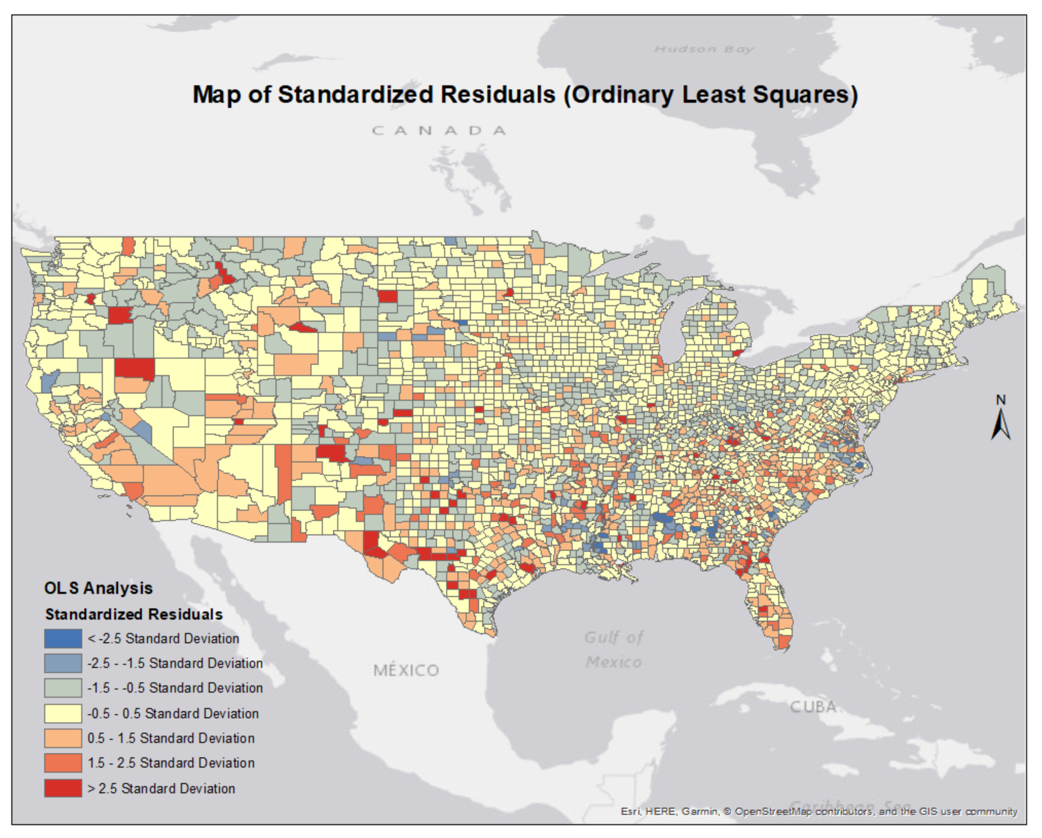 Completed with: ArcGIS (Spatial Statistics: Global Moran's I, Ordinary Least Squares, and Geographically Weighted Regression)